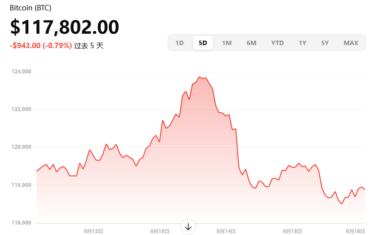 当前市场价格约 $117,802,日内下跌约 0.85%。日内高点触及 $119,288,低点为 $116,953。