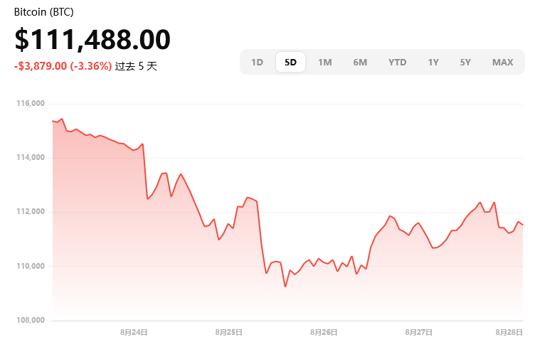当前价格约 $111,488,日内涨幅约 +0.3%,盘中震荡区间 $110K–$112.6K 。
