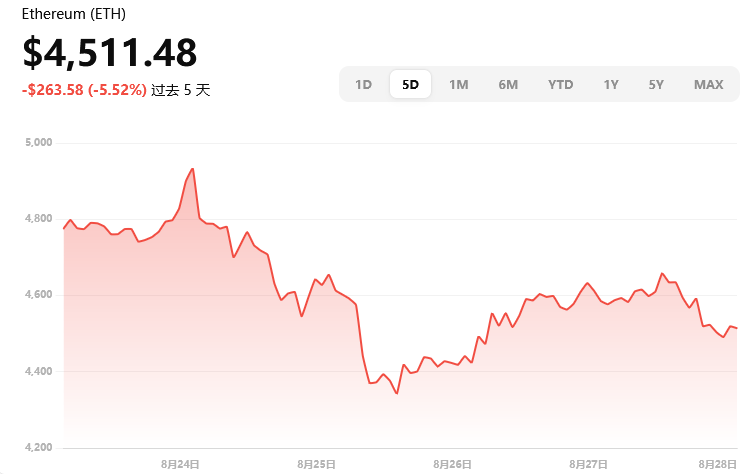 当前价格约 $4,511,日内下跌约 -1.5%,日内高低分别为 $4,658 和 $4,472 。