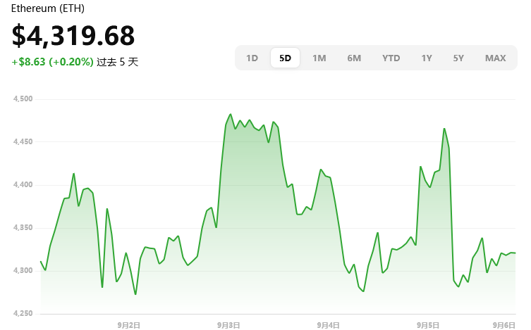 当前价位:约 $4,319.68,日内略涨,波动区间为 $4,261.78 – $4,474.72 。