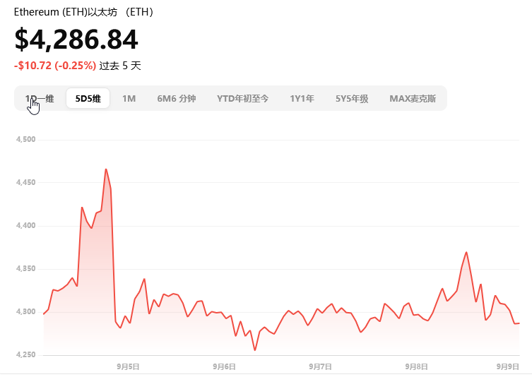 行情概览:以太坊目前约 $4,286.84,日内微幅上涨,盘中波幅介于 $4,281–$4,381。